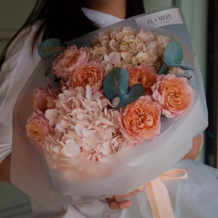Евро-Букет из Гортензии ,Розовых Роз,Лизиантусов и Эвкалипта + открытка ручной работы в подарок