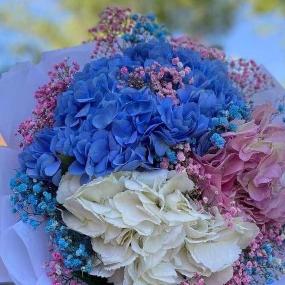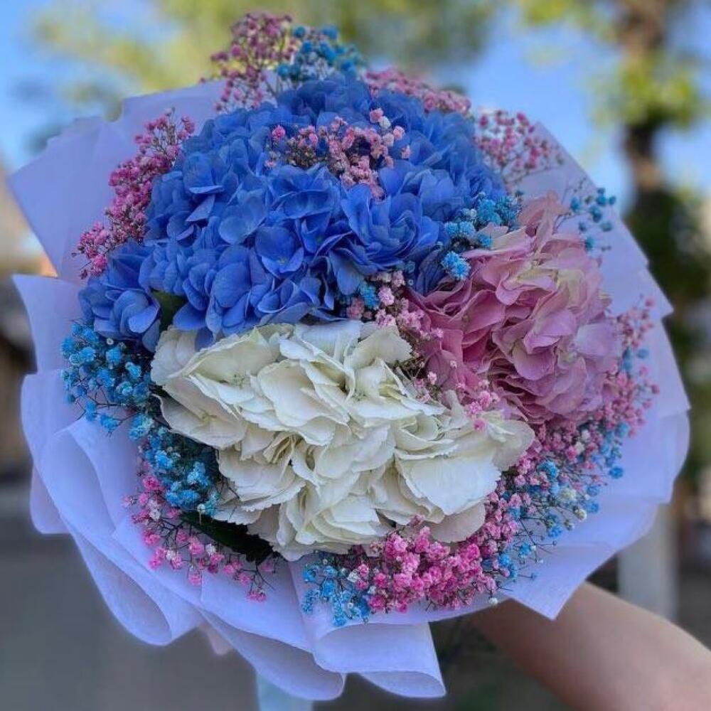 Гортензия розовая – 1 шт.гортензий голубая – 1 шт.Гортензия белая – 1 шт.гипсофила радужная – 12 шт.Упаковка дизайнерская – 1 шт.Лента атласная – 2 шт.Открыточка с вашими пожеланиями – 1 шт.хорошее настроение – 100 шт.инструкция по уходу за цветами – 1 шт.коробка переноска – 1 шт.Кризал – 1 шт.