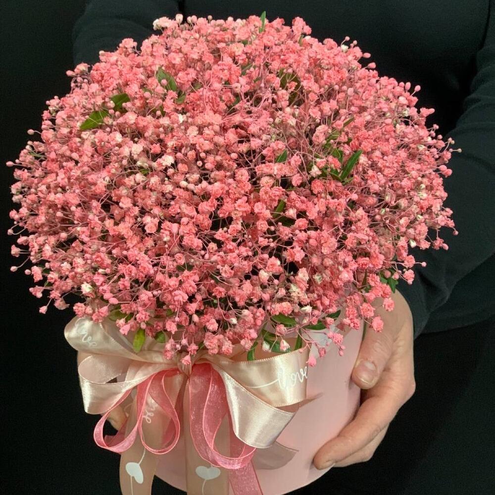 “Сиреневый туман” – композиция из гипсофилы в шляпной коробке