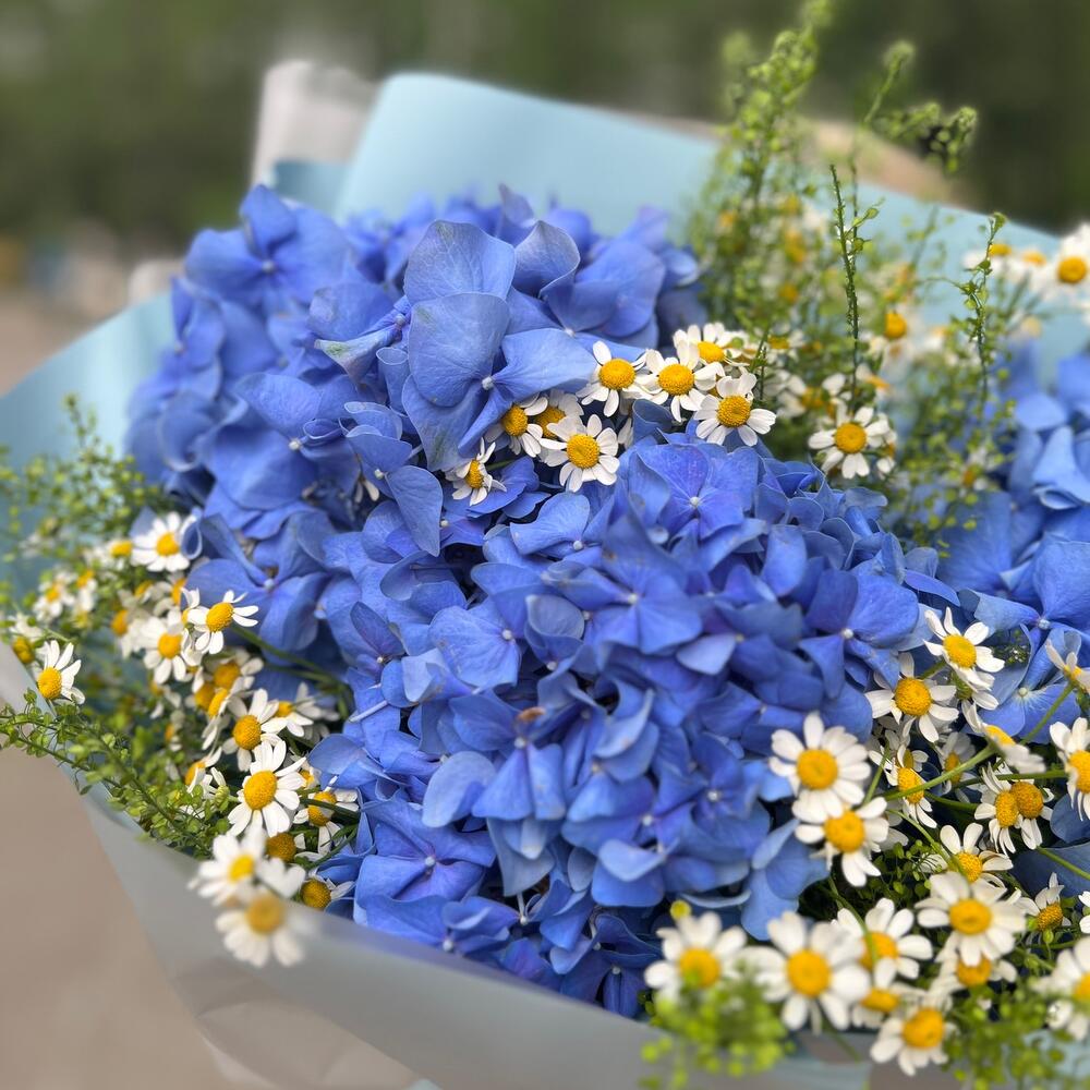 Гортензия – 3 шт.Лента атласная – 1 шт.Упаковка дизайнерская – 6 шт.Ромашка – 6 шт.Гринбелл – 4 шт.