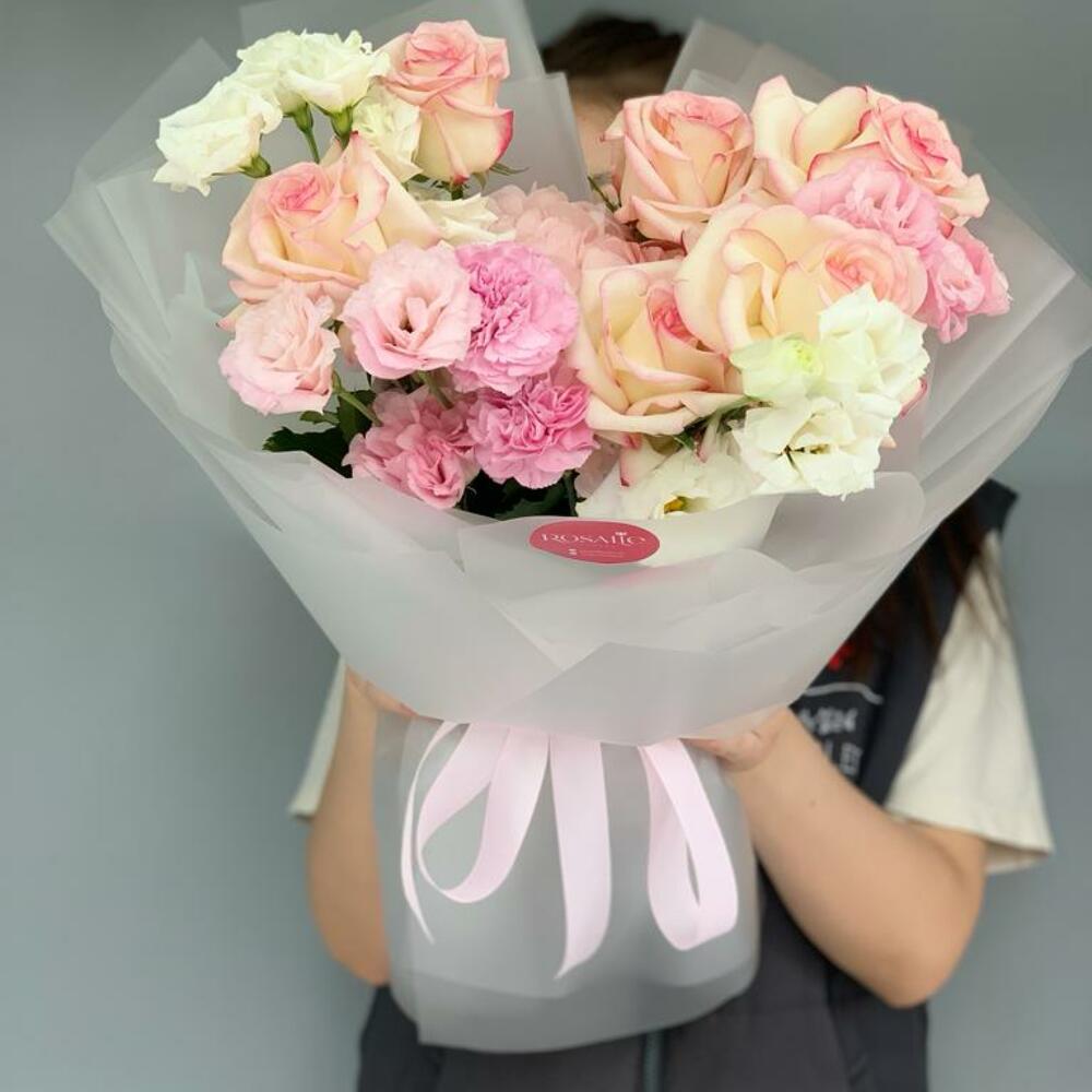 Гвоздики, Лизиантусы, Розы, Тюльпаны