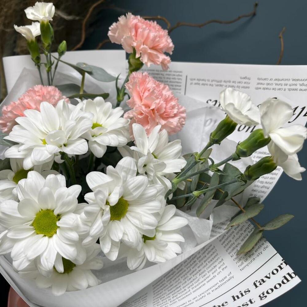 Букет «Нежность» с кустовыми гвоздиками, кустовой хризантемой и гвоздиками