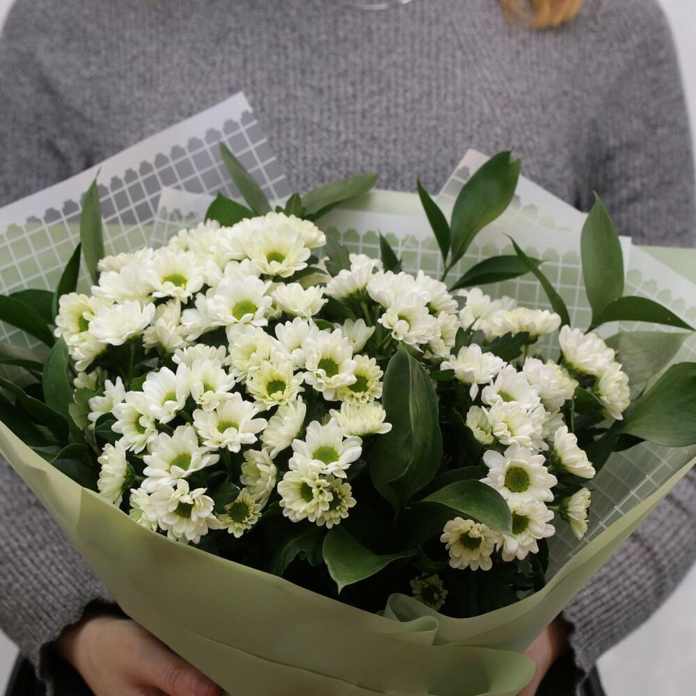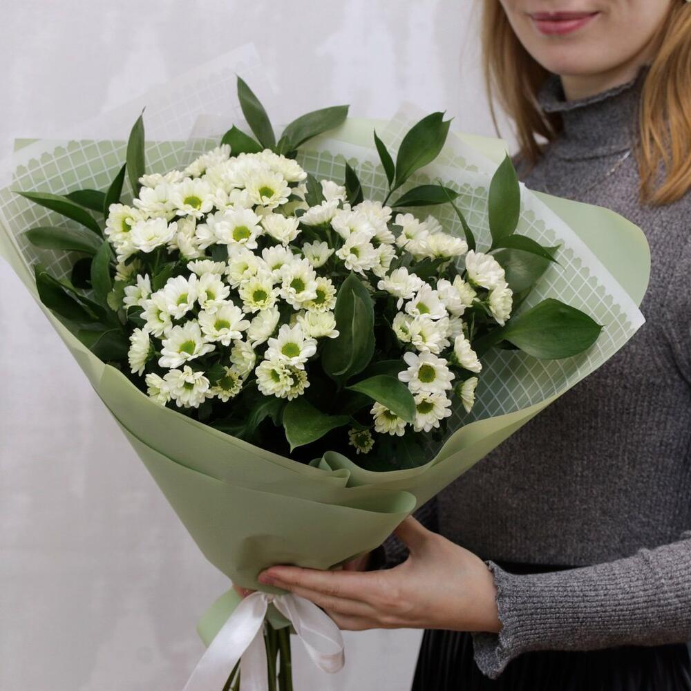 Букет из 11 белых кустовых хризантем Сантини с зеленью