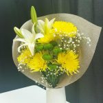 Лилия белая – 1 шт.Хризантема – 5 шт.Хризантема кустовая – 1 шт.Гипсофила – 2 шт.Упаковка – 1 шт.