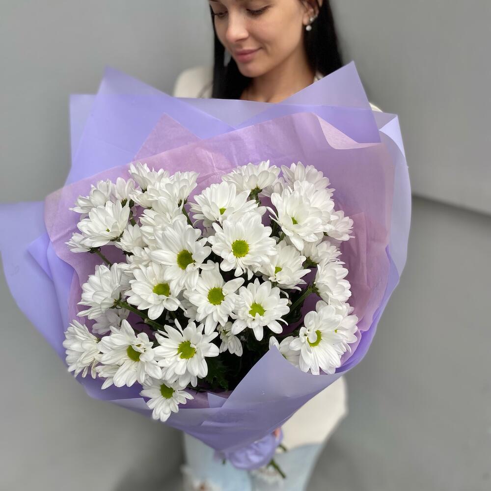 Лента атласная – 1 шт.Упаковка дизайнерская – 1 шт.хризантема кустовая чик – 5 шт.