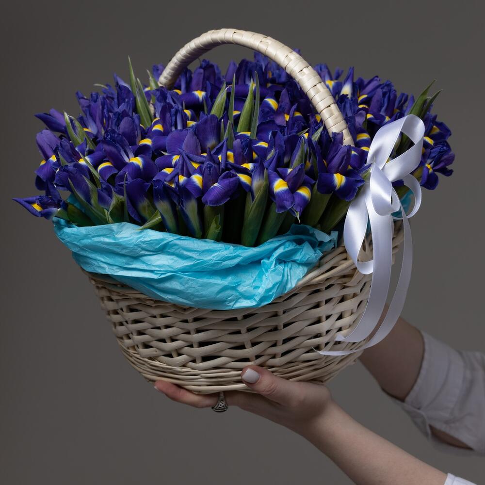 Ирис – 51 шт.Корзина плетеная – 1 шт.Лента атласная – 1 шт.Открыточка с вашими пожеланиями – 1 шт.хорошее настроение – 100 шт.инструкция по уходу за цветами – 1 шт.Кризал – 1 шт.