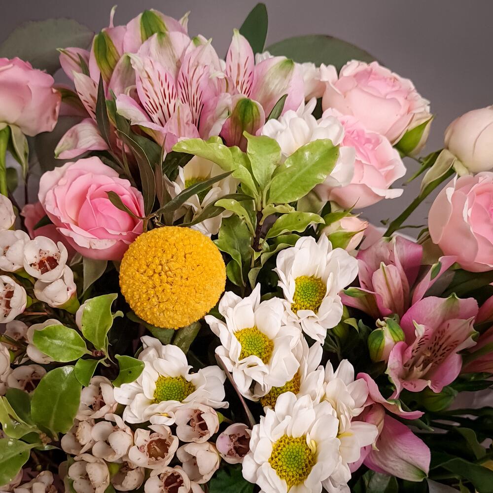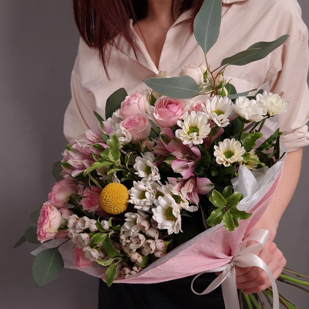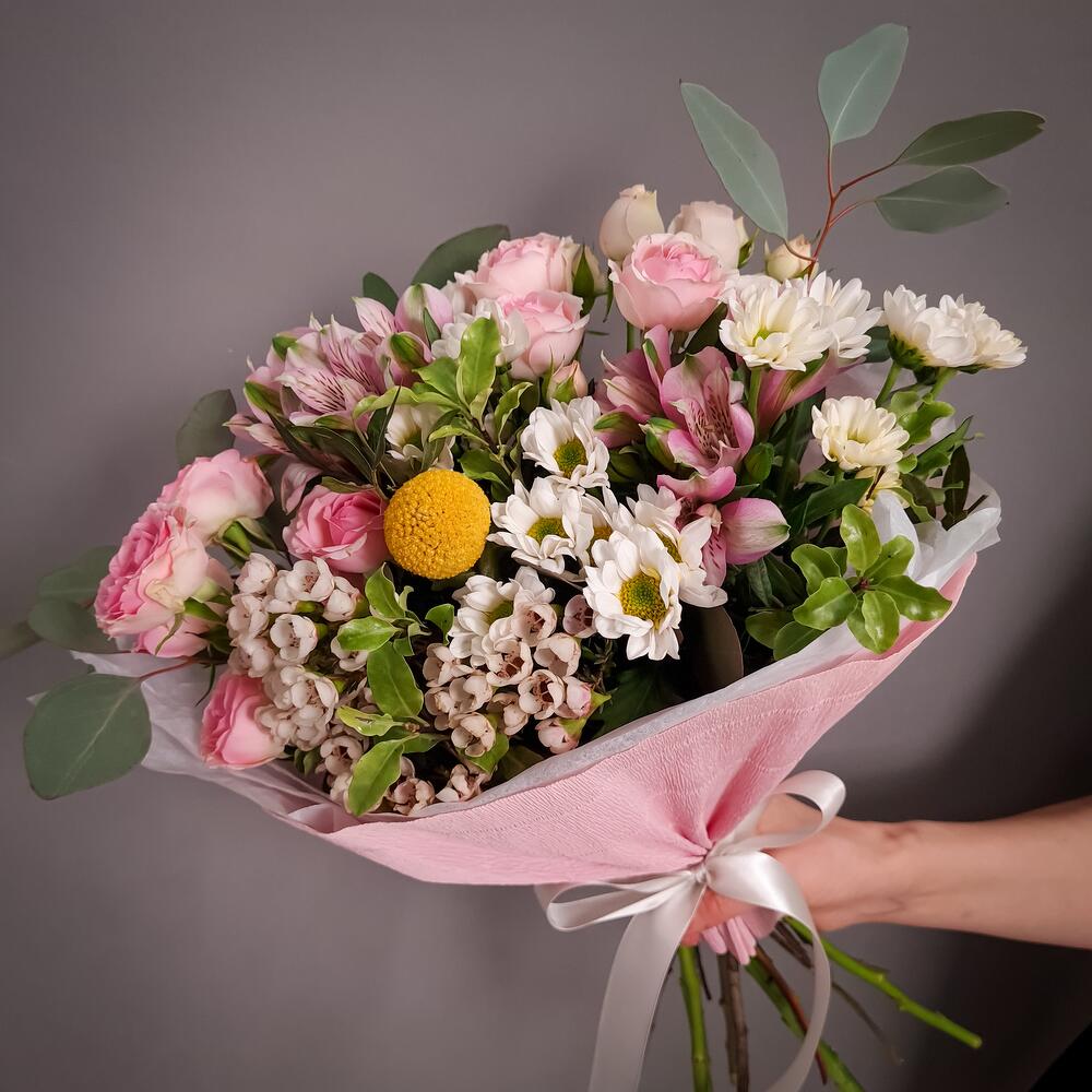 Альстромерия – 2 шт.Ваксфлауэр – 3 шт.Краспедия – 1 шт.Питтоспорум – 1 шт.Роза кустовая – 2 шт.Эвкалипт – 1 шт.Упаковка – 1 шт.Сантини – 3 шт.Аквапак – 1 шт.подкормка для срезанных цветов – 2 шт.