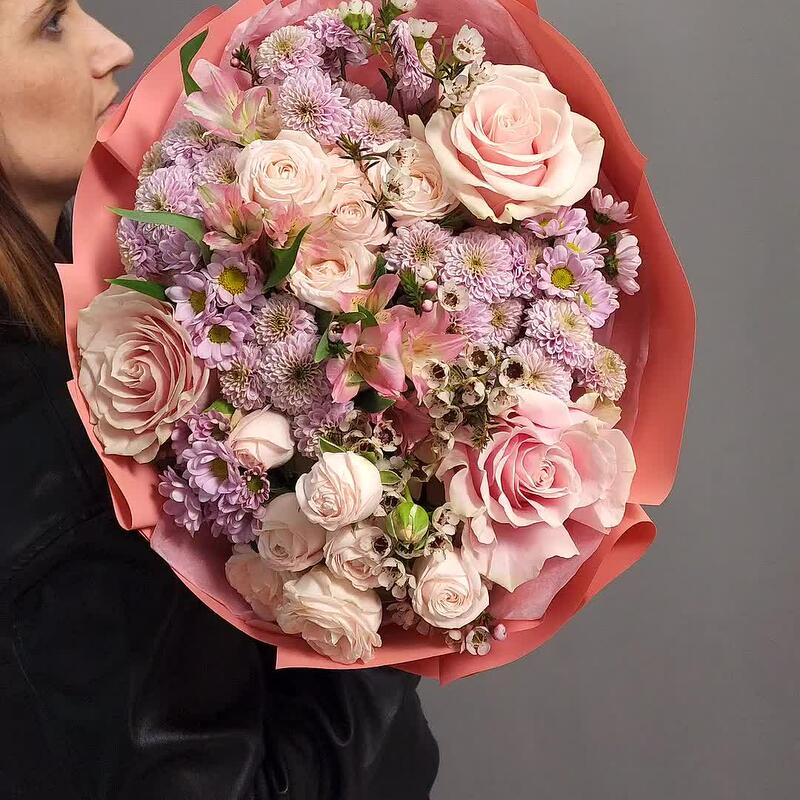 Альстромерии, Гортензии, Кустовые розы, Лизиантусы, Розы, Хризантемы