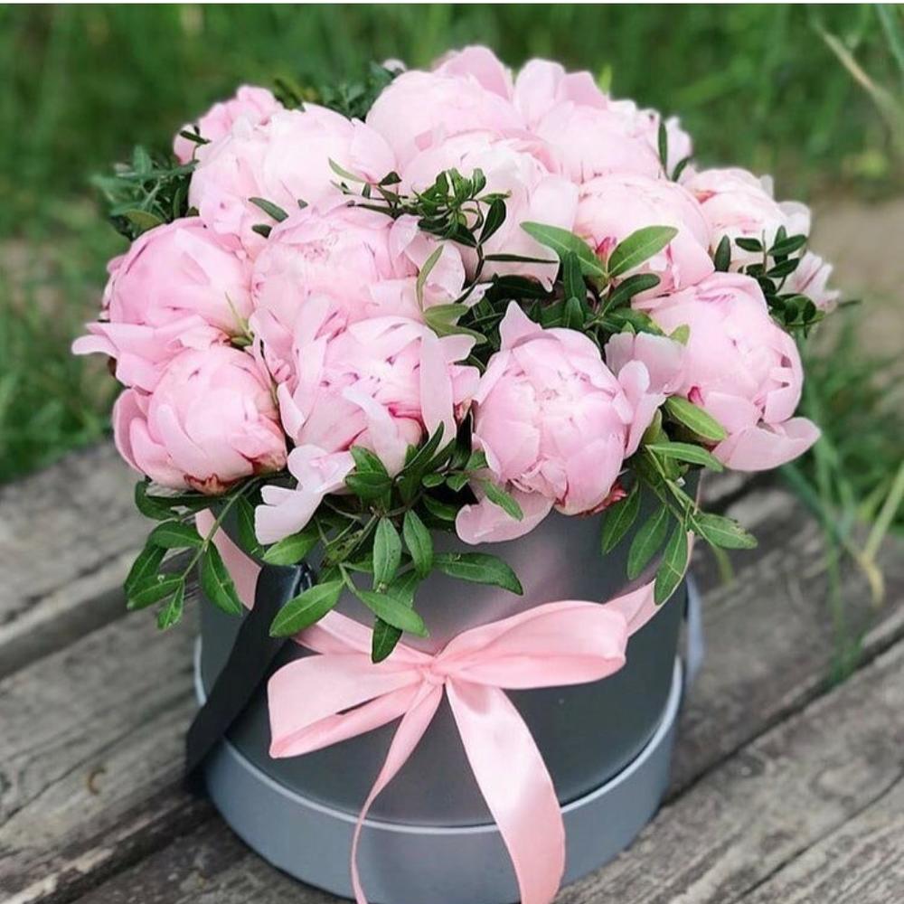 Лента атласная – 1 шт.Коробка шляпная – 1 шт.Фисташка – 5 шт.Пион Сара Бернар – 15 шт.Оазис флористический – 1 шт.