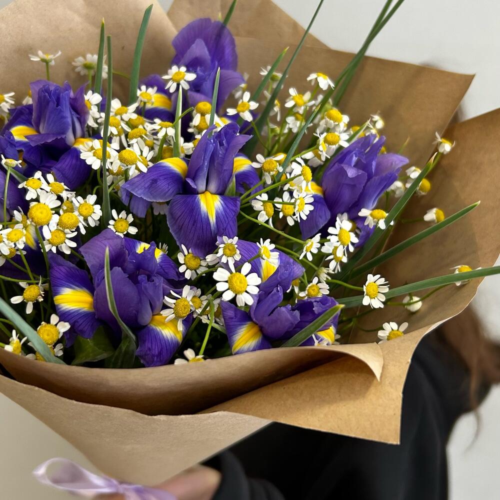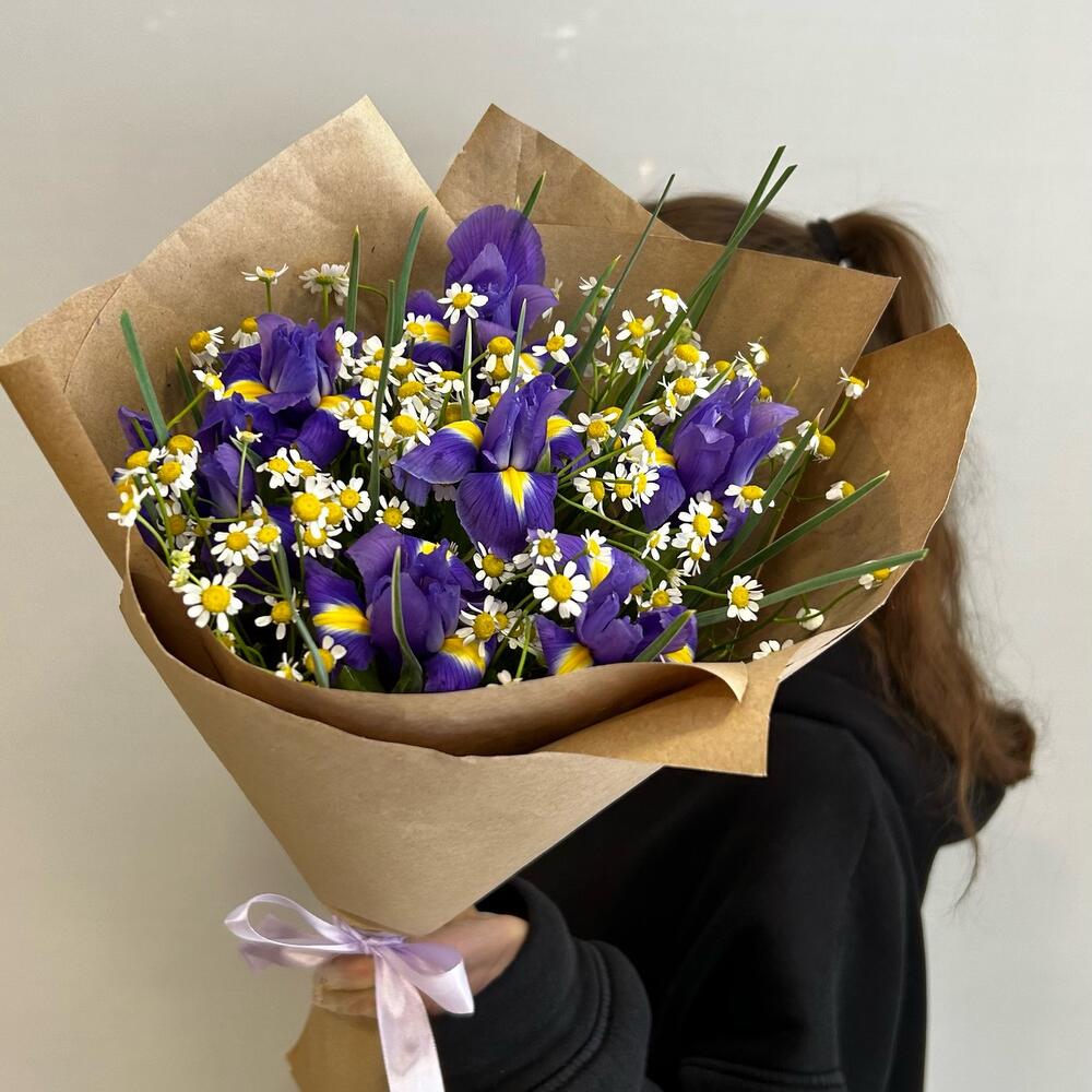 Ирис – 7 шт.Ромашка кустовая – 6 шт.Зелень – 2 шт.Упаковка дизайнерская – 2 шт.