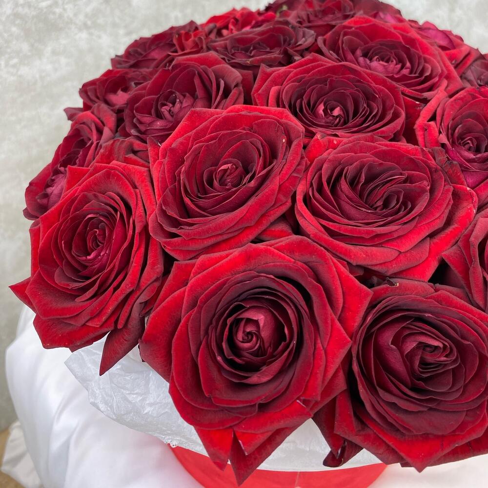 27 элитных роз в шляпной бархатной коробке