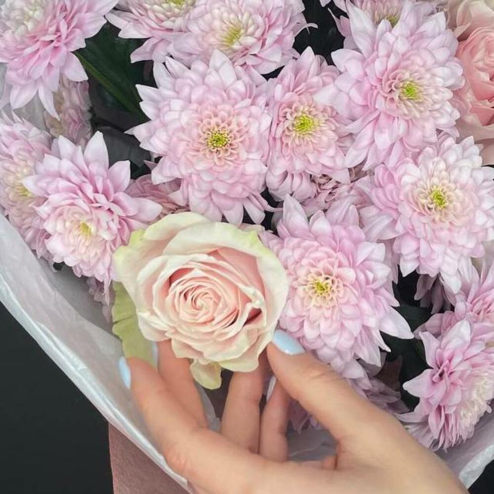 Роза Эквадор – 3 шт.Хризантема кустовая – 4 шт.Дизайнерская упаковка – 1 шт.