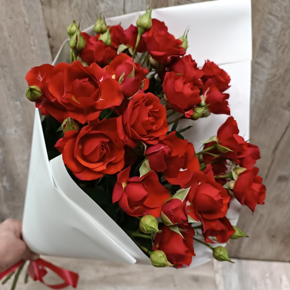 Роза кустовая – 5 шт.Пленка белая – 1 шт.Лента атласная – 1 шт.