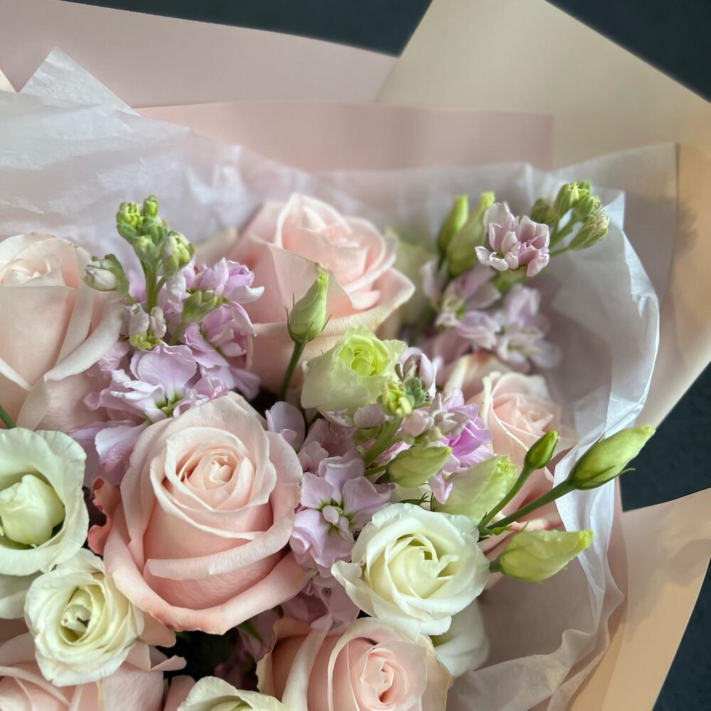 Букет из нежной розы, маттиолы и эустомы