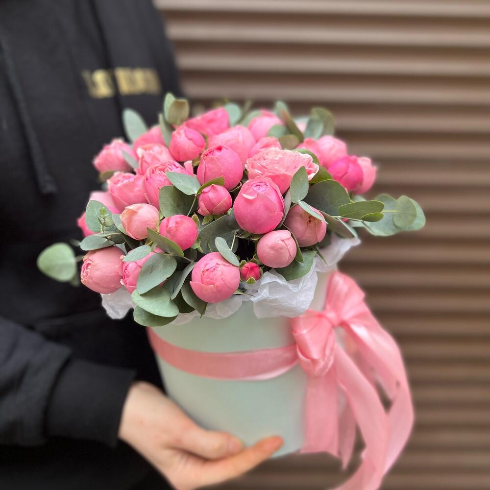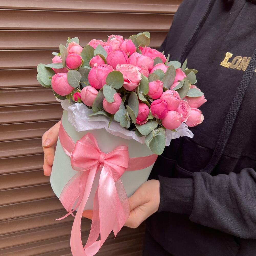 Эвкалипт – 10 шт.Лента атласная – 3 шт.Тишью – 1 шт.Коробка шляпная – 1 шт.Оазис флористический – 1 шт.сильвия пинк пионовидная кустовая роза – 11 шт.
