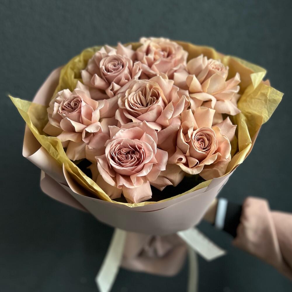Роза мокко – 7 шт.Дизайнерская упаковка – 1 шт.Лента атласная – 1 шт.
