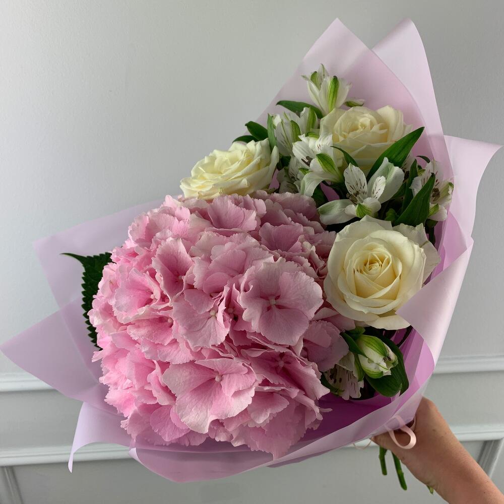 Альстромерия – 2 шт.Лента – 1 шт.Роза Россия – 3 шт.Гортензия розовая – 1 шт.Матовая пленка – 1 шт.любовь флориста (бесплатно) – 1 шт.