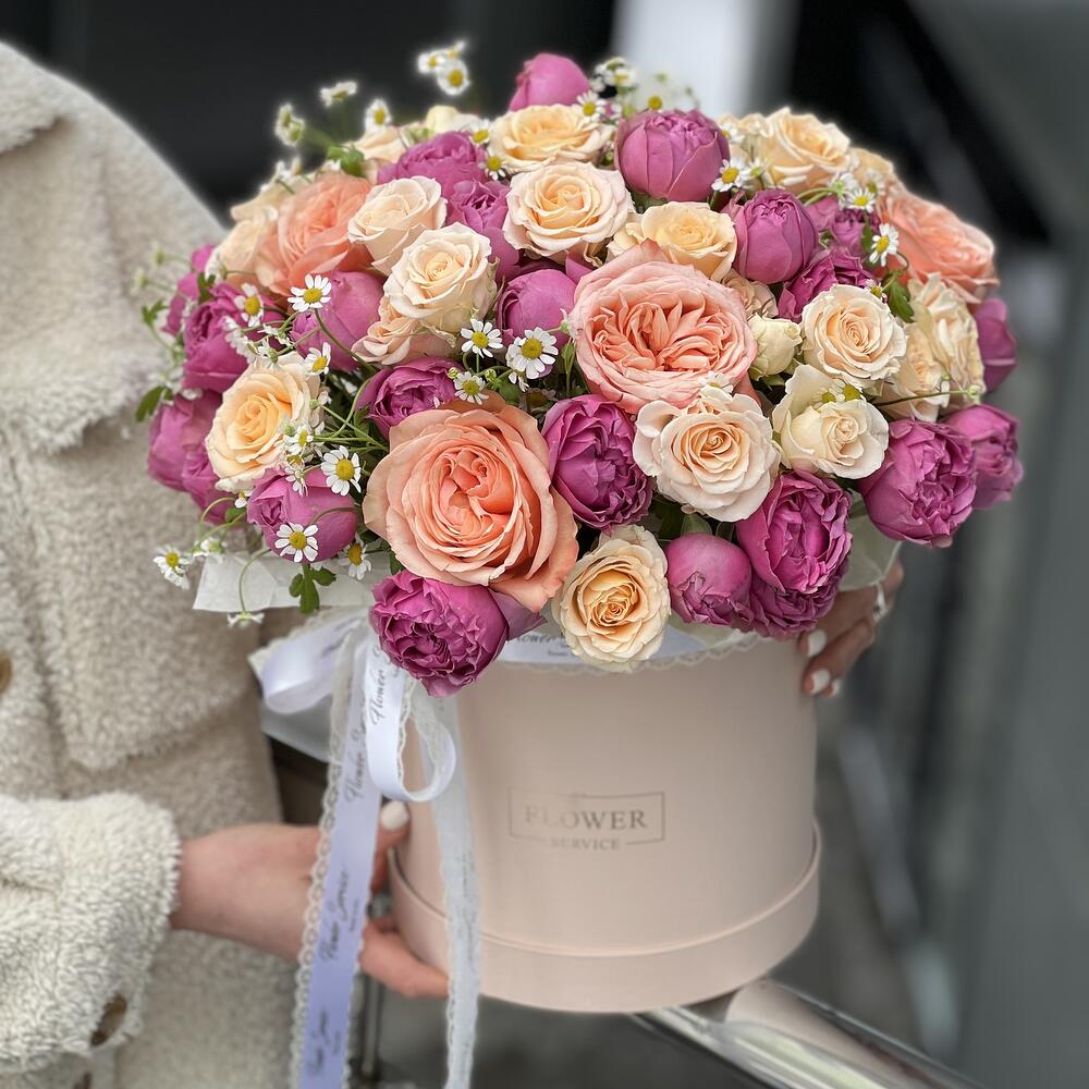 Стильная композиция из игривых ромашек, микса кустовых роз и одноголовых сорта Кахала!