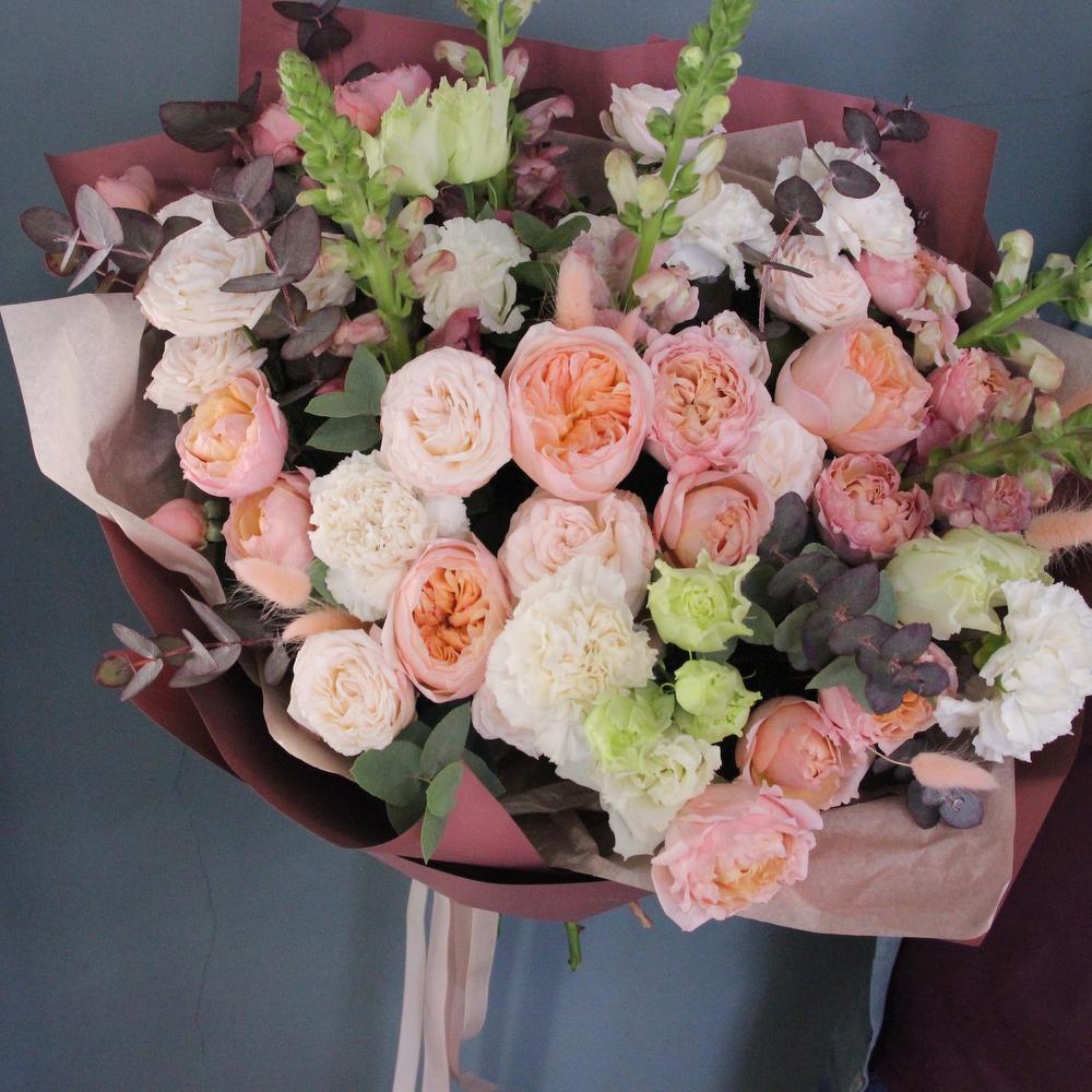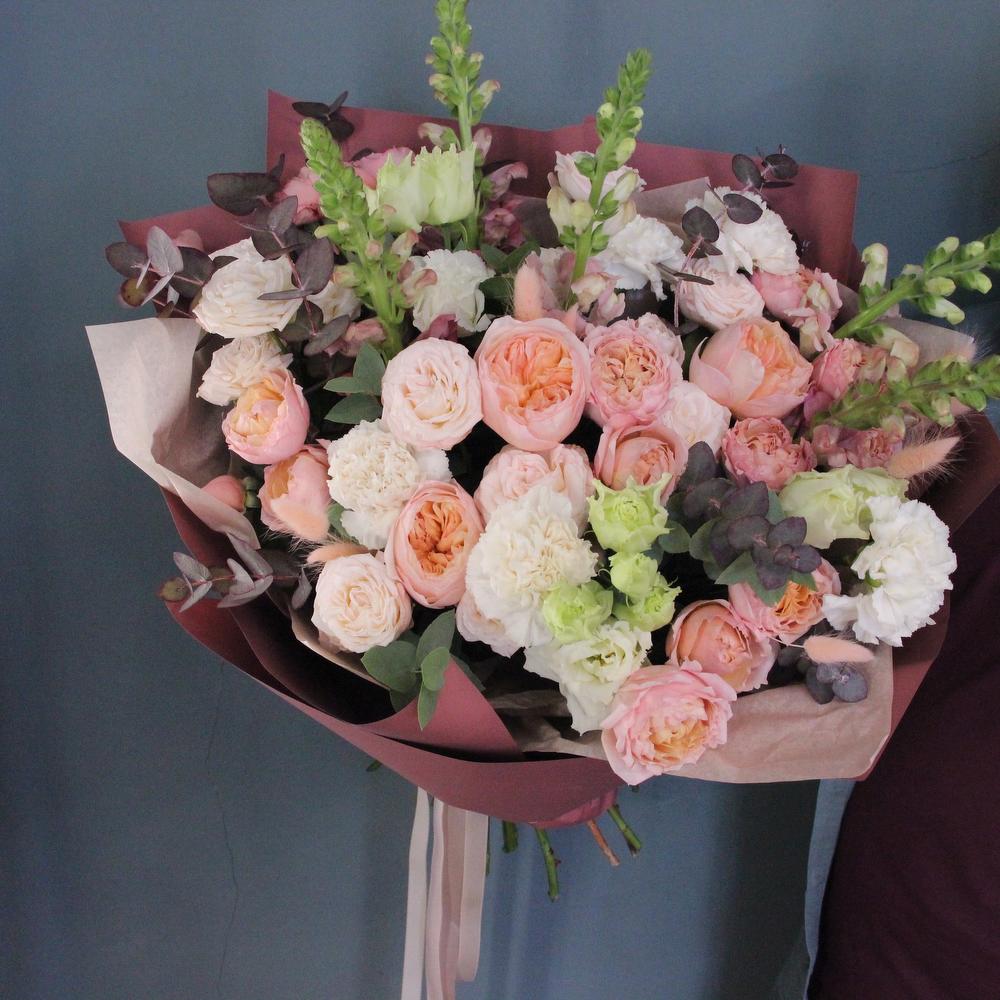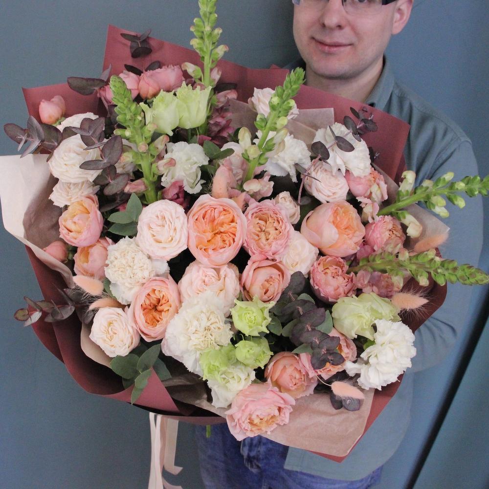 Роза пионовидная кустовая – 5 шт.Роза пионовидная – 3 шт.Львиный зев – 5 шт.Эвкалипт – 5 шт.Диантус – 7 шт.Фисташка – 3 шт.Лизиантус – 4 шт.Тишью – 3 шт.Бумага – 3 шт.Лента атласная – 2 шт.Лагурус – 15 шт.