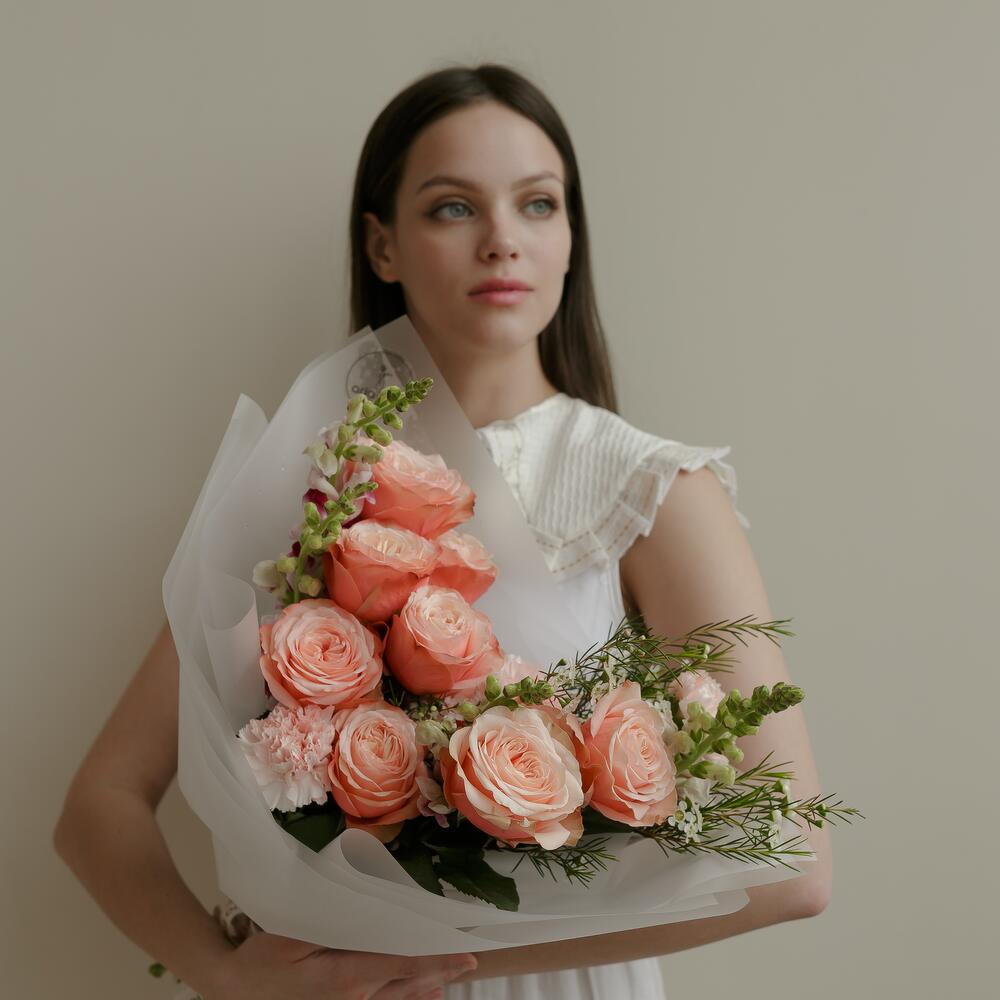 Роза Эквадор – 9 шт.Гвоздика – 4 шт.Фисташка – 3 шт.Хамелациум – 1 шт.Упаковка дизайнерская – 1 шт.антиринум – 4 шт.любовь флориста – 1 шт.подкормка для цветов – 1 шт.инструкция по уходу за цветочками – 1 шт.