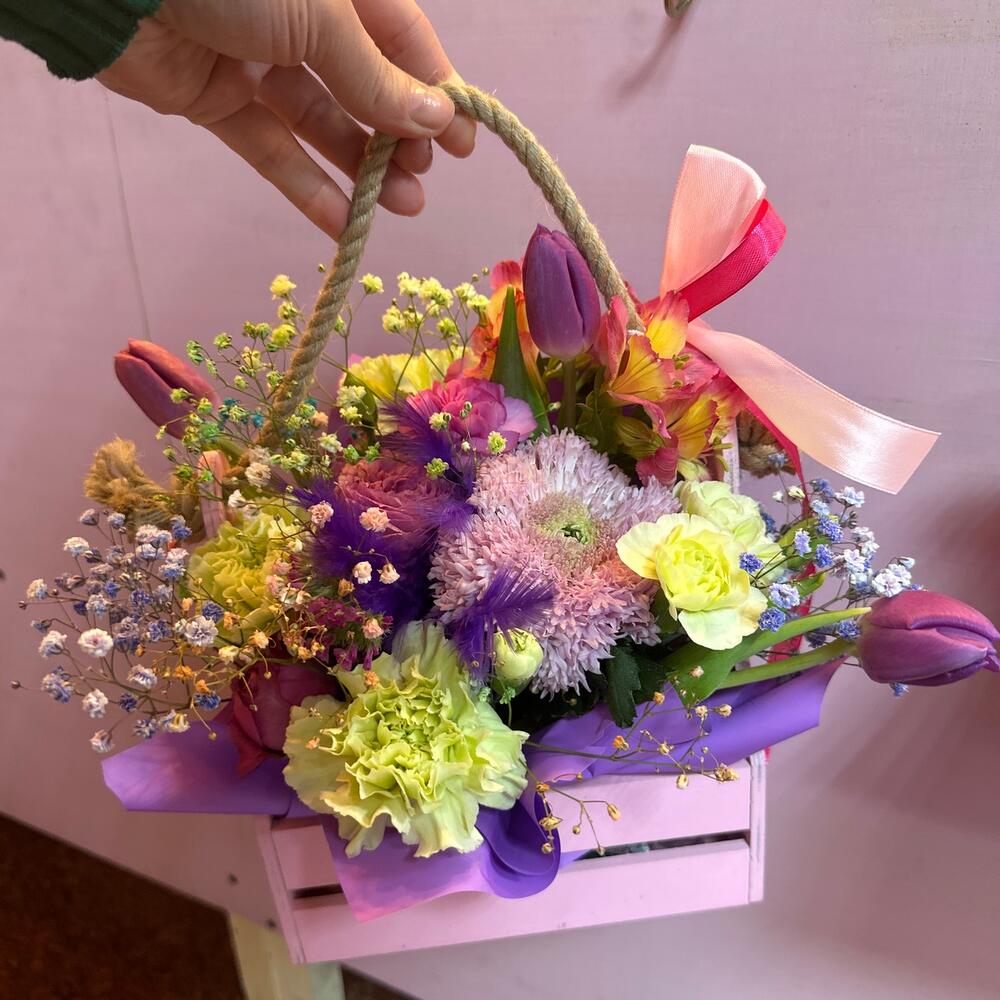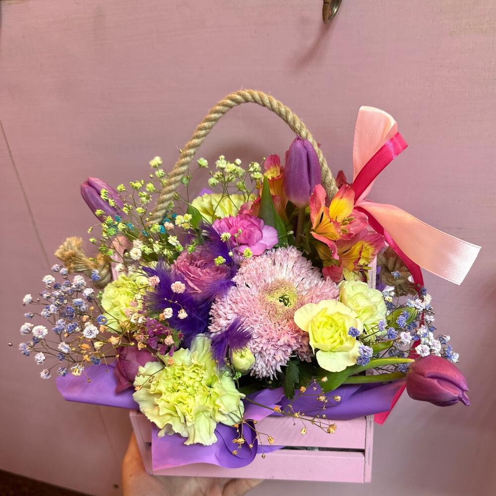 Тюльпан – 3 шт.кустовая роза мисти баблез – 1 шт.Гвоздика кустовая – 2 шт.Гвоздика – 3 шт.Гипсофила – 2 шт.Губка флористическая – 1 шт.Ящик деревянный – 1 шт.Лента атласная – 2 шт.Статица – 1 шт.Хризантема этруско – 1 шт.