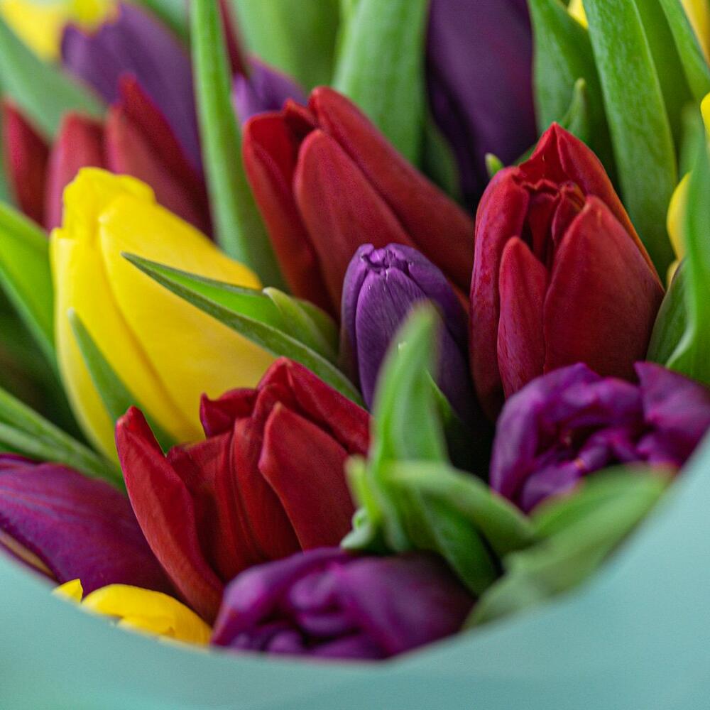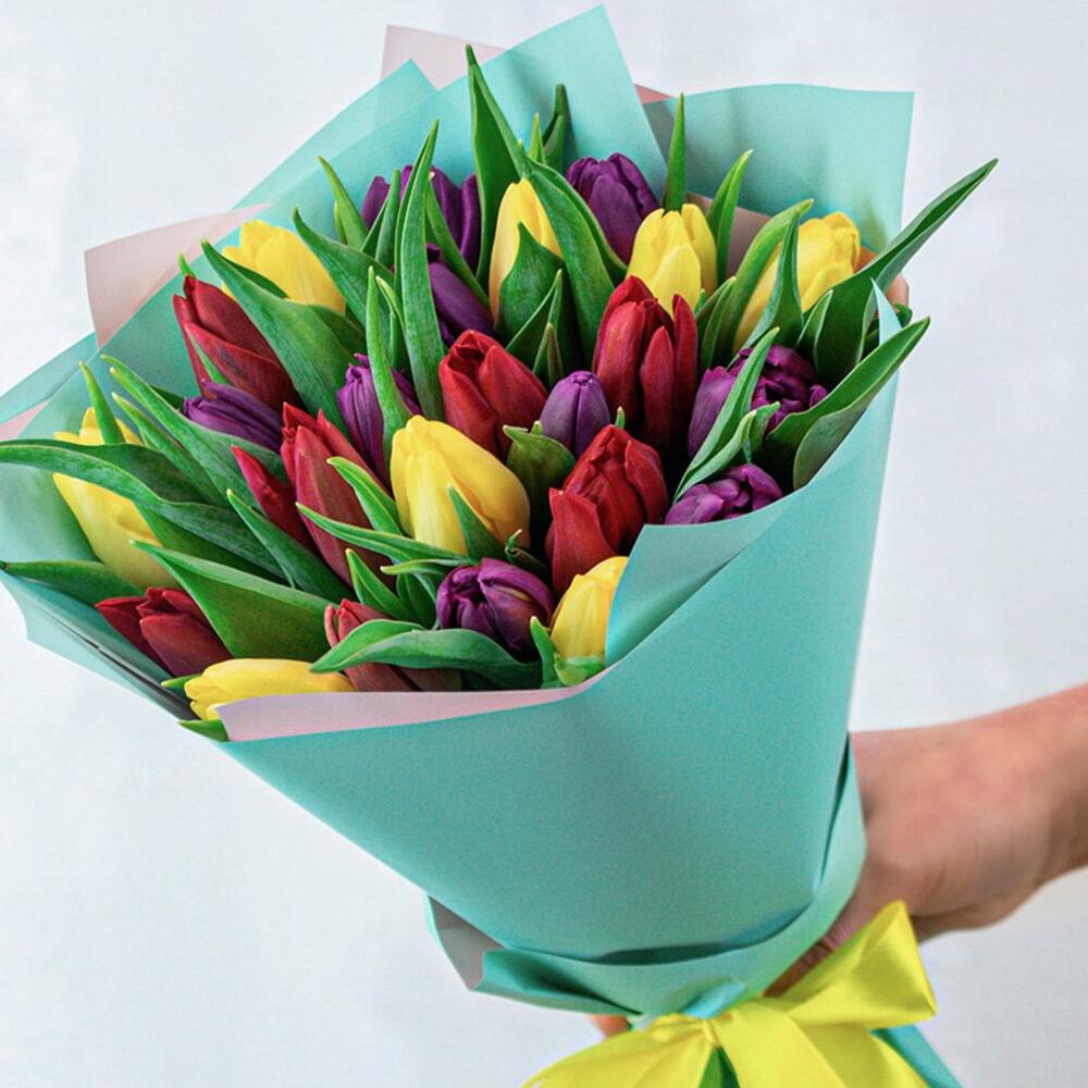 Букет из 25 тюльпанов стандарт яркий микс в упаковке