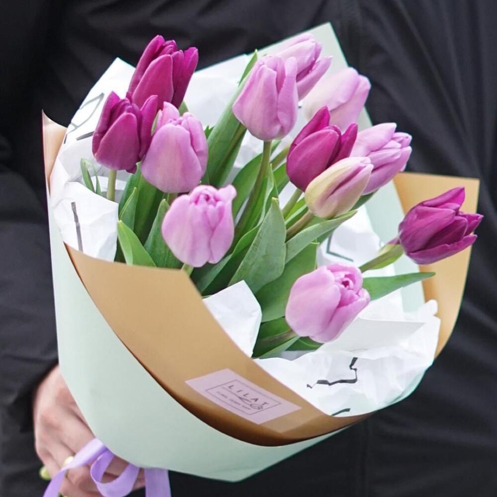 Тюльпан – 13 шт. Дизайнерская упаковка – 13 шт. Открыточка с вашими пожеланиями – 1 шт. инструкция по уходу за цветами – 1 шт.